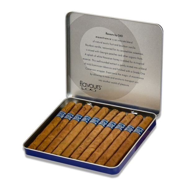 The CAO Flavours Moontrance Cigarillos offer a unique fusion of exotic fruit and bourbon vanilla in a smooth, aromatic 4 x 30 format. Wrapped in a delicate Cameroon leaf and filled with Dominican tobaccos, these small cigars deliver rich notes of peach nectar, vanilla cream, and a subtle hint of caramel. Perfectly sized for quick, flavorful breaks, this 10-count tin is a favorite among fans of infused cigars looking for a sweet, satisfying smoke with a tropical twist.